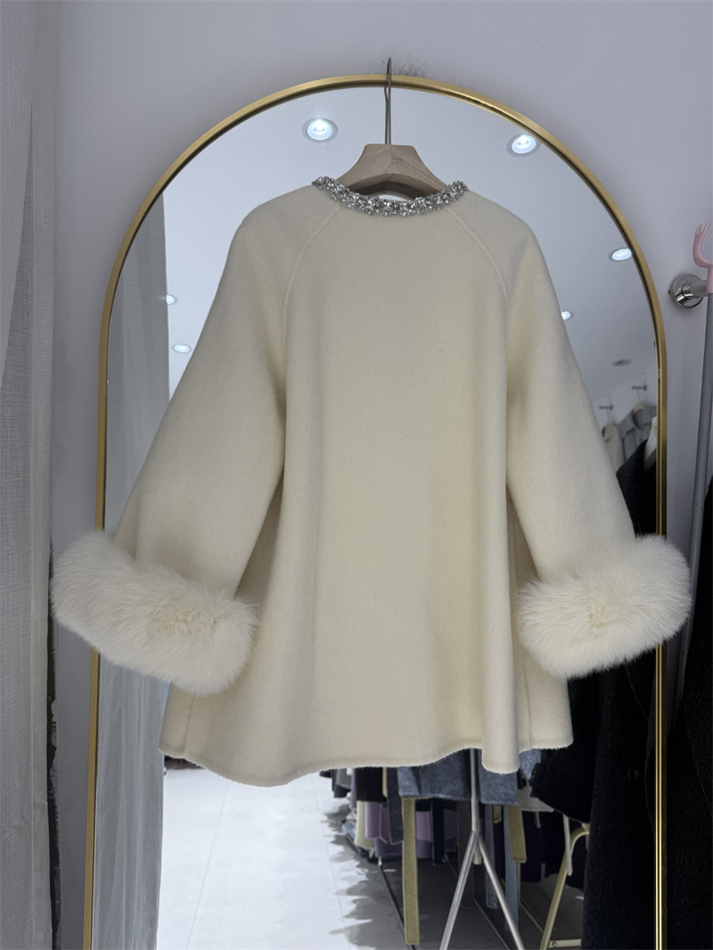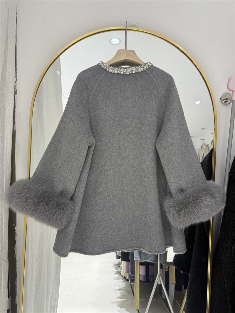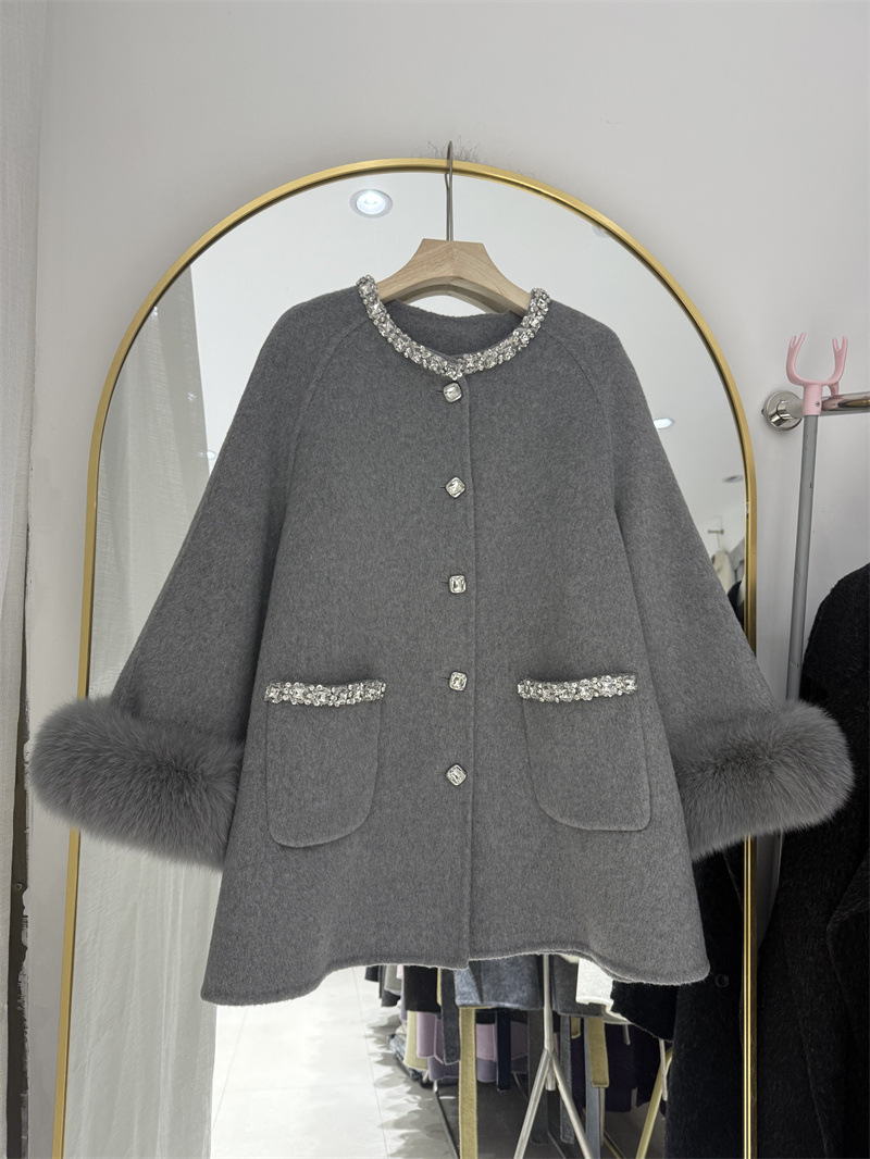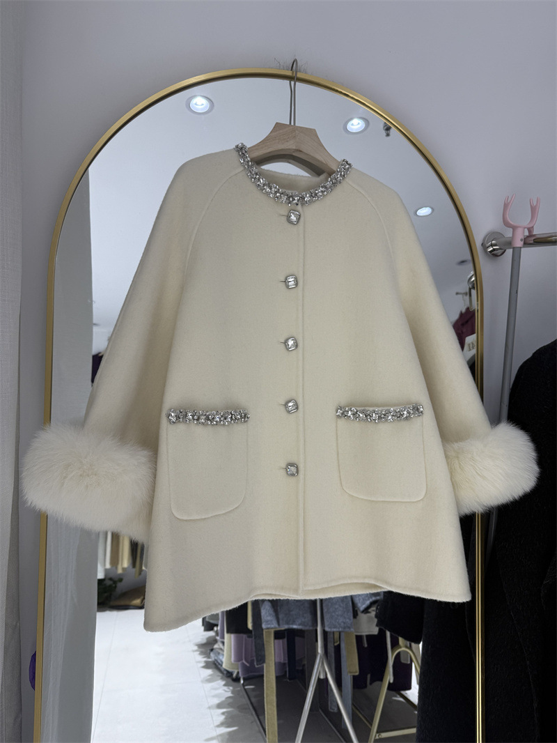 狐狸毛袖 手工钻领 双面羊毛大衣女富家千金感呢子外套秋季小香风